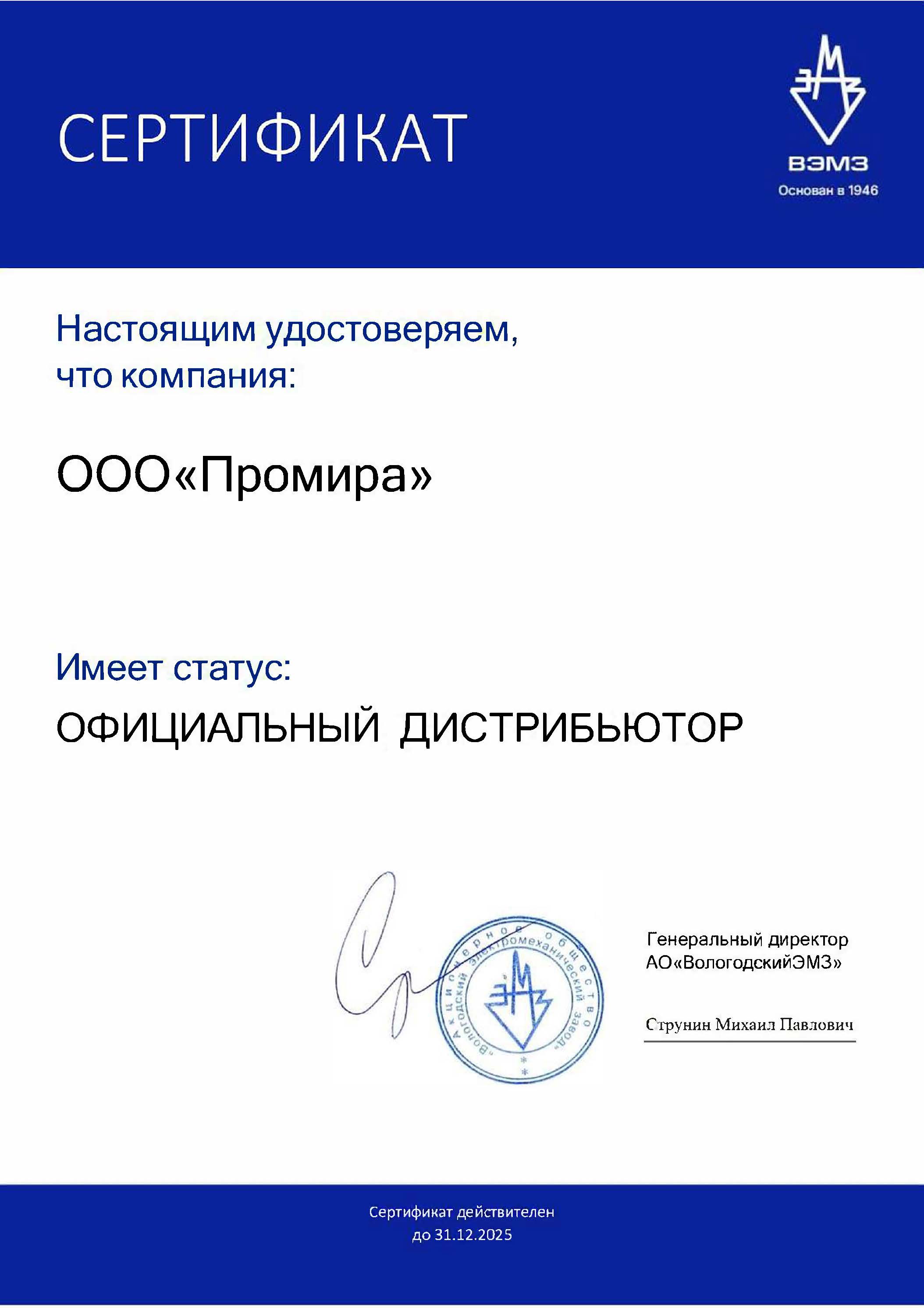 СЕРТИФИКАТ-Промира
