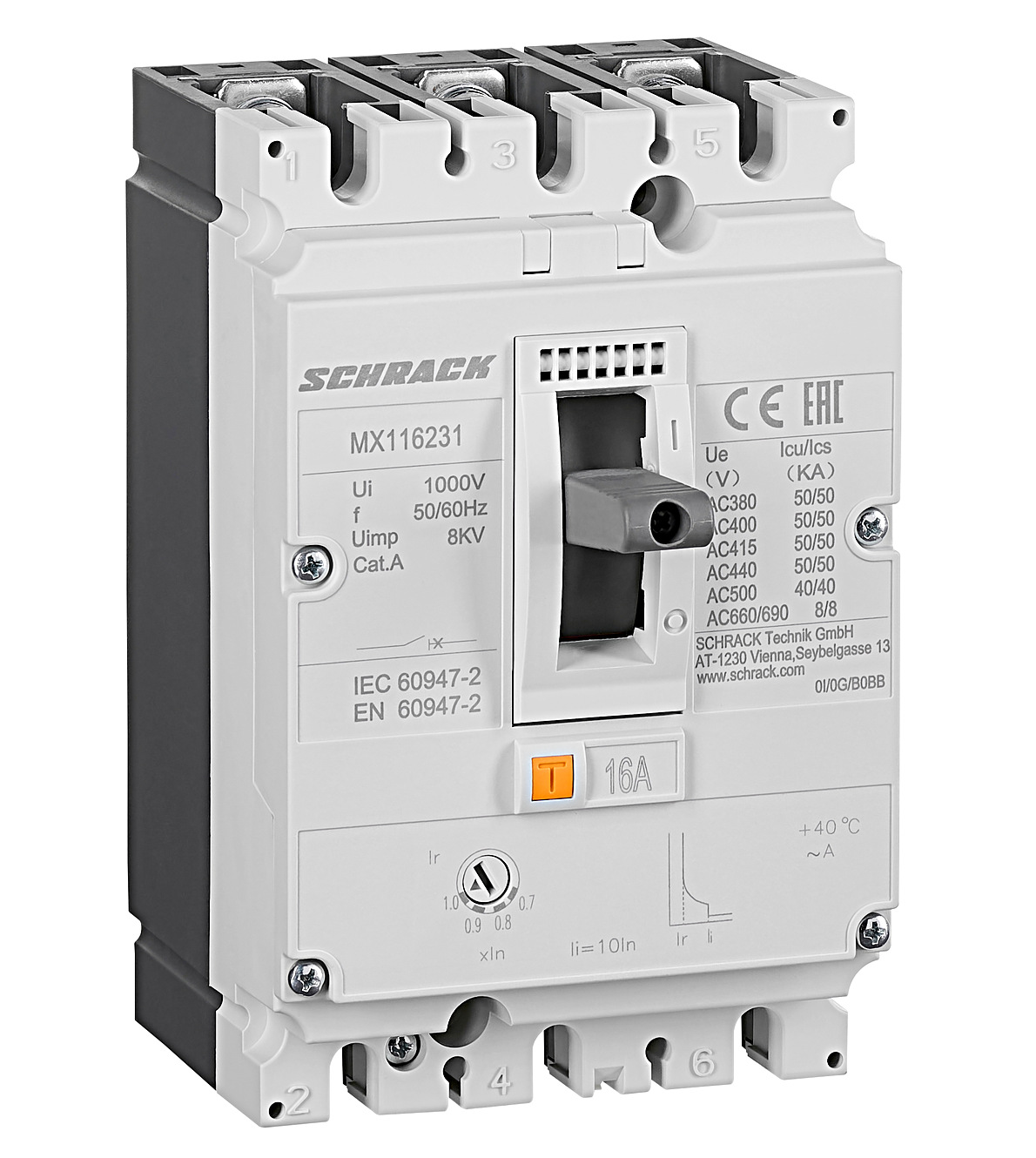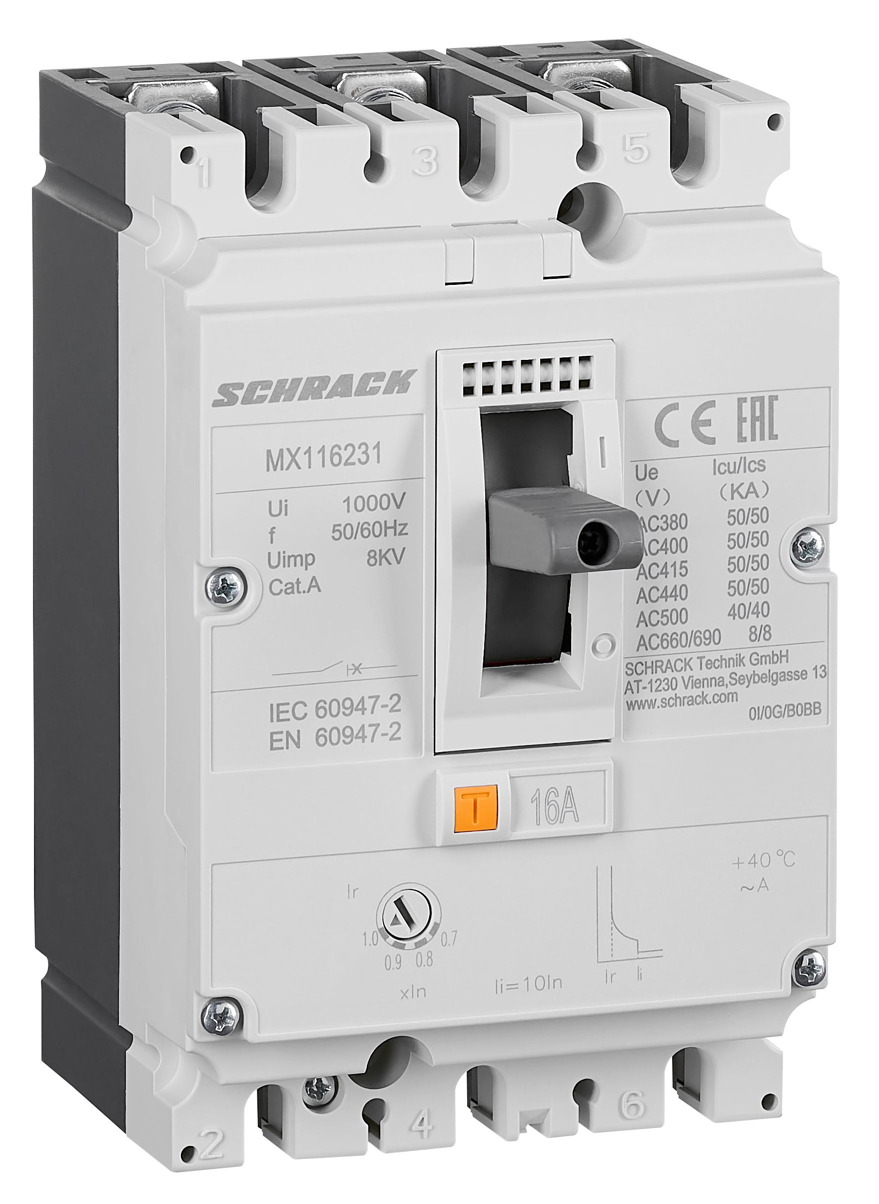 - AC 380/400/415V 50kA (Icu) / 50kA (Ics)