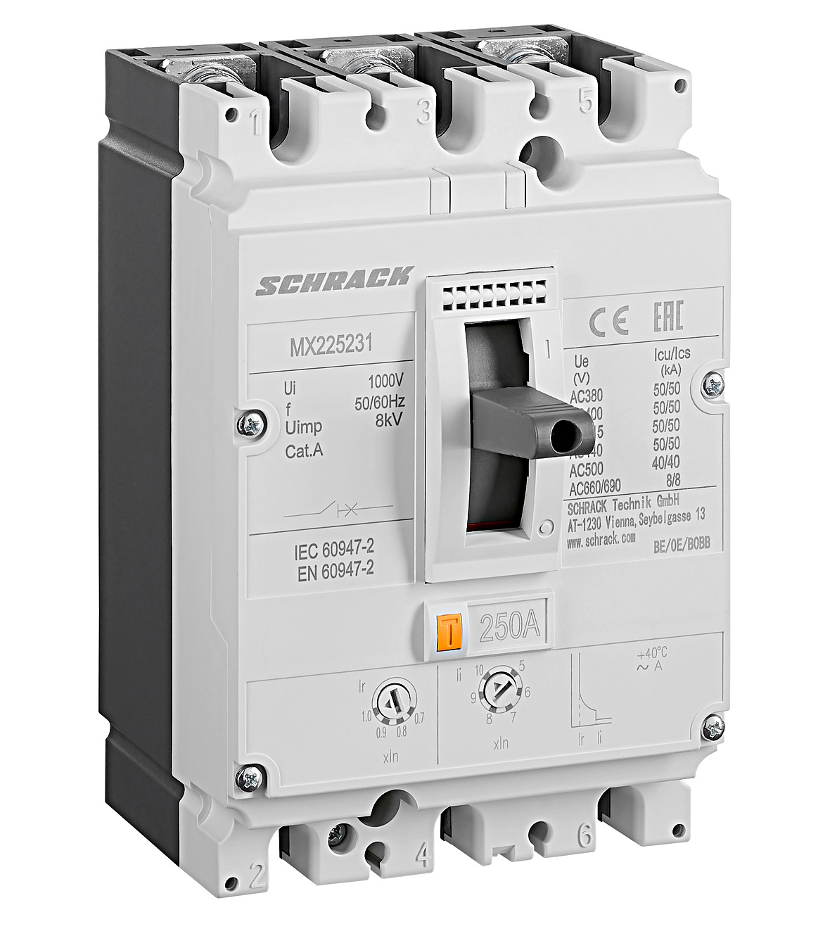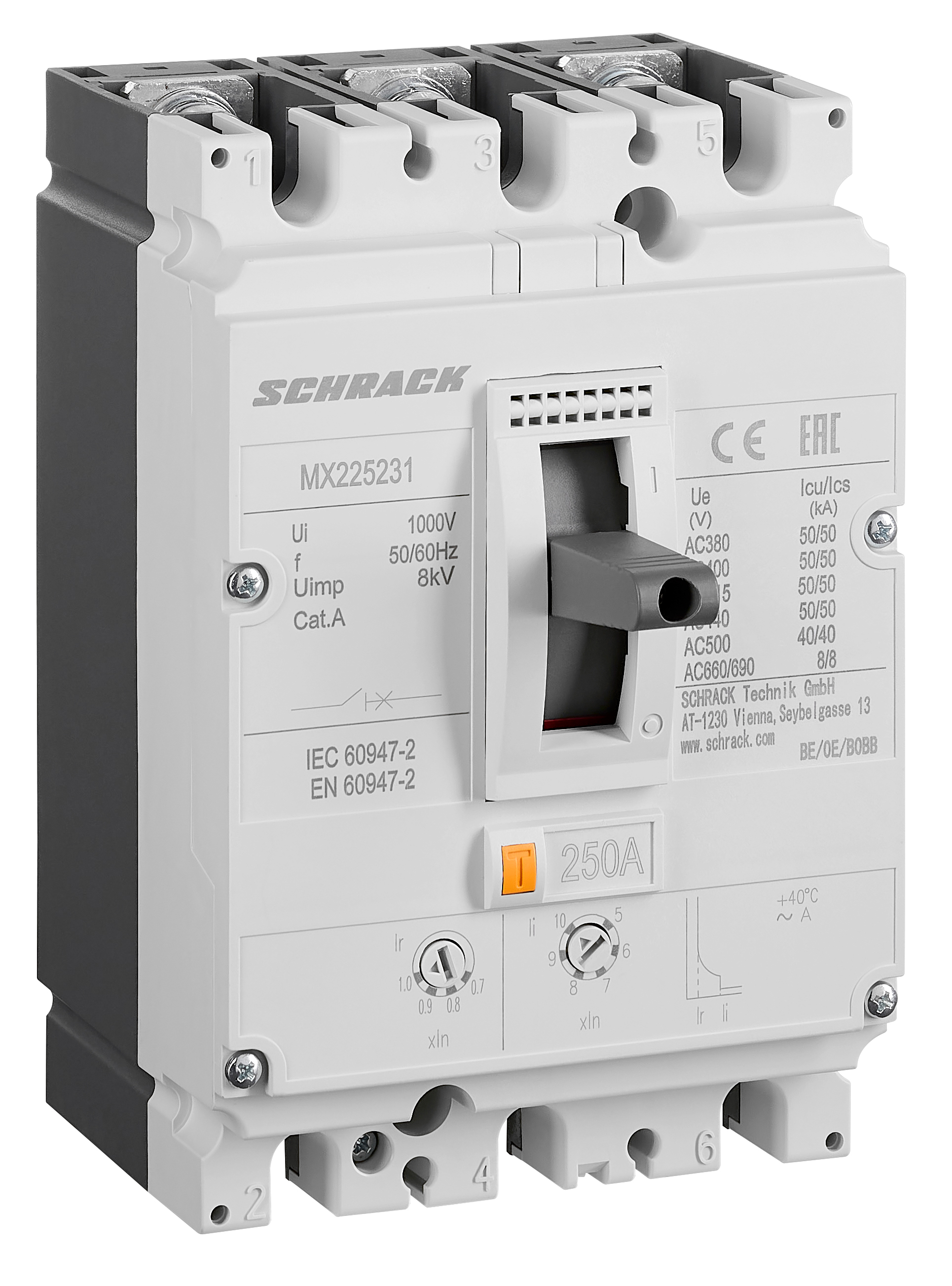 - AC 380/400/415V 50kA (Icu) / 50kA (Ics)